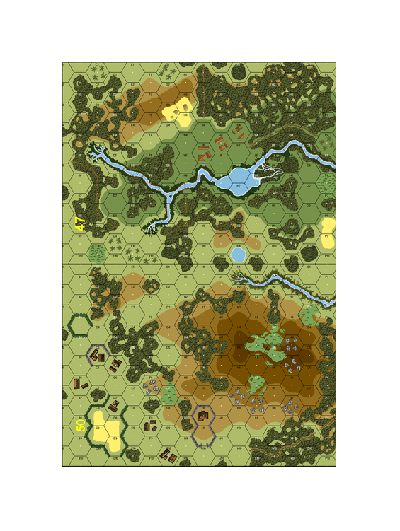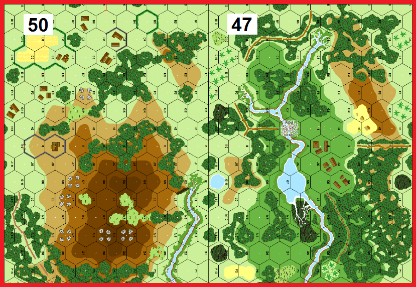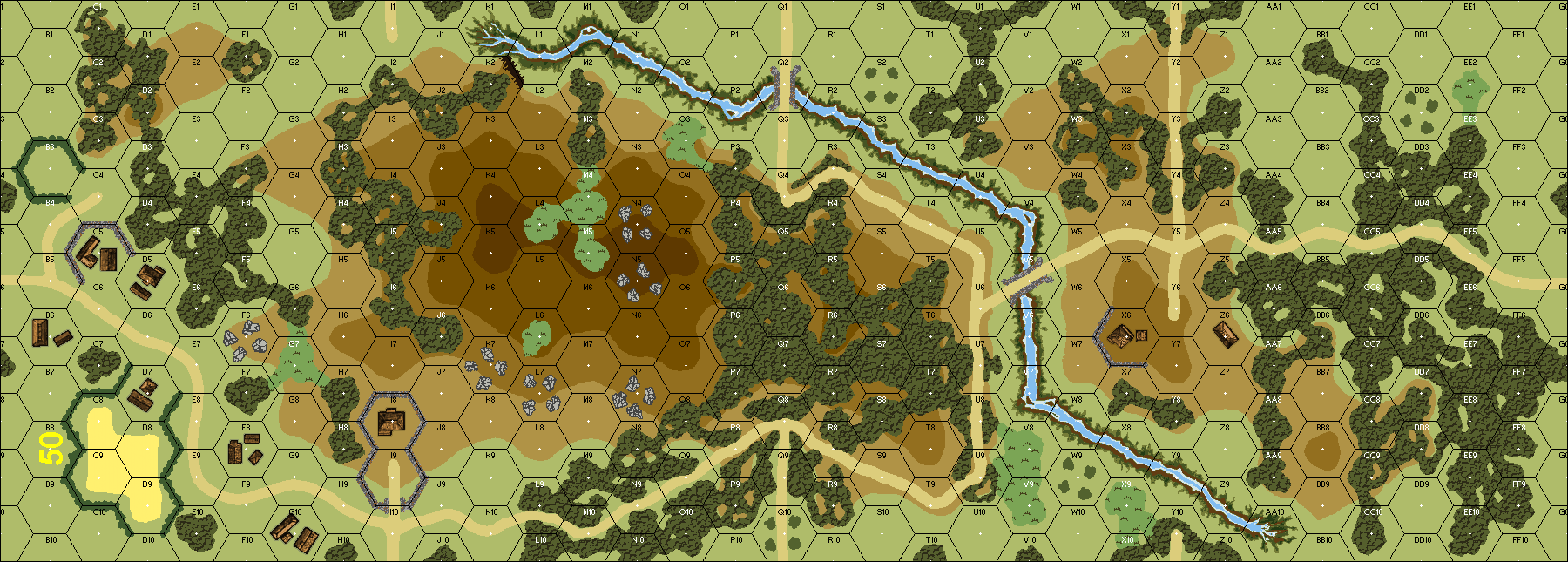 Misc Rules: | PTO, LJ (Exc: Brush remains Brush). A: may not Recombine until Turn 5 w D: Gun set up on hill hex |